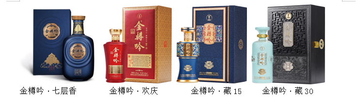 金樽吟为了满足不同消费人群的需求,针对不同消费场景,推出了金樽吟·七层香、金樽吟·欢庆、金樽吟·藏15、金樽吟·藏30等多款酱酒产品。