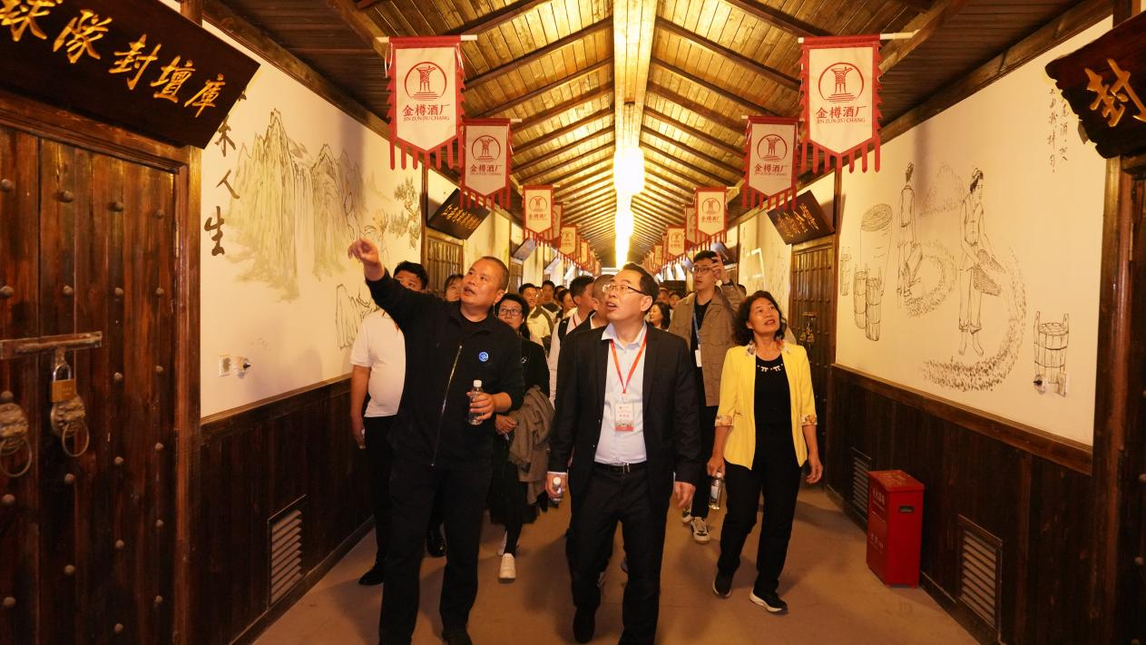代表团首先参观了金樽酒厂的酿造车间,亲眼目睹了从摊晾、发酵到蒸馏取酒的全过程,不禁感叹金樽酒厂对品质的极致追求,也深感酿酒不仅是一门工艺,更是一门艺术。在车间里,金樽酒厂酿造专家余吉岸分享了金樽酒厂的酿酒工艺,并为代表团们答疑解惑。